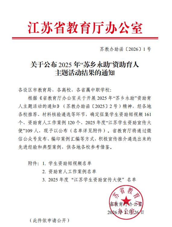 1月27日,江苏省教育厅公布2025年“苏乡永助”资助育人主题活动评选结果,beat365报送的学生资助短视频《助学逐梦 向光而行》《我贤有所为 助人也育人》获评优秀作品;经济管理学院2023级学生岳明君获评2025年度“江苏学生资助宣传大使”。